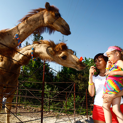 В зоопарке у нас живут верблюды, лошади, козлы, утки и кролики. Наблюдать за курицами и петухами можно в любое время, так как они свободно гуляют по территории. Кроме этого, у нас можно покормить животных и покататься на верблюде.